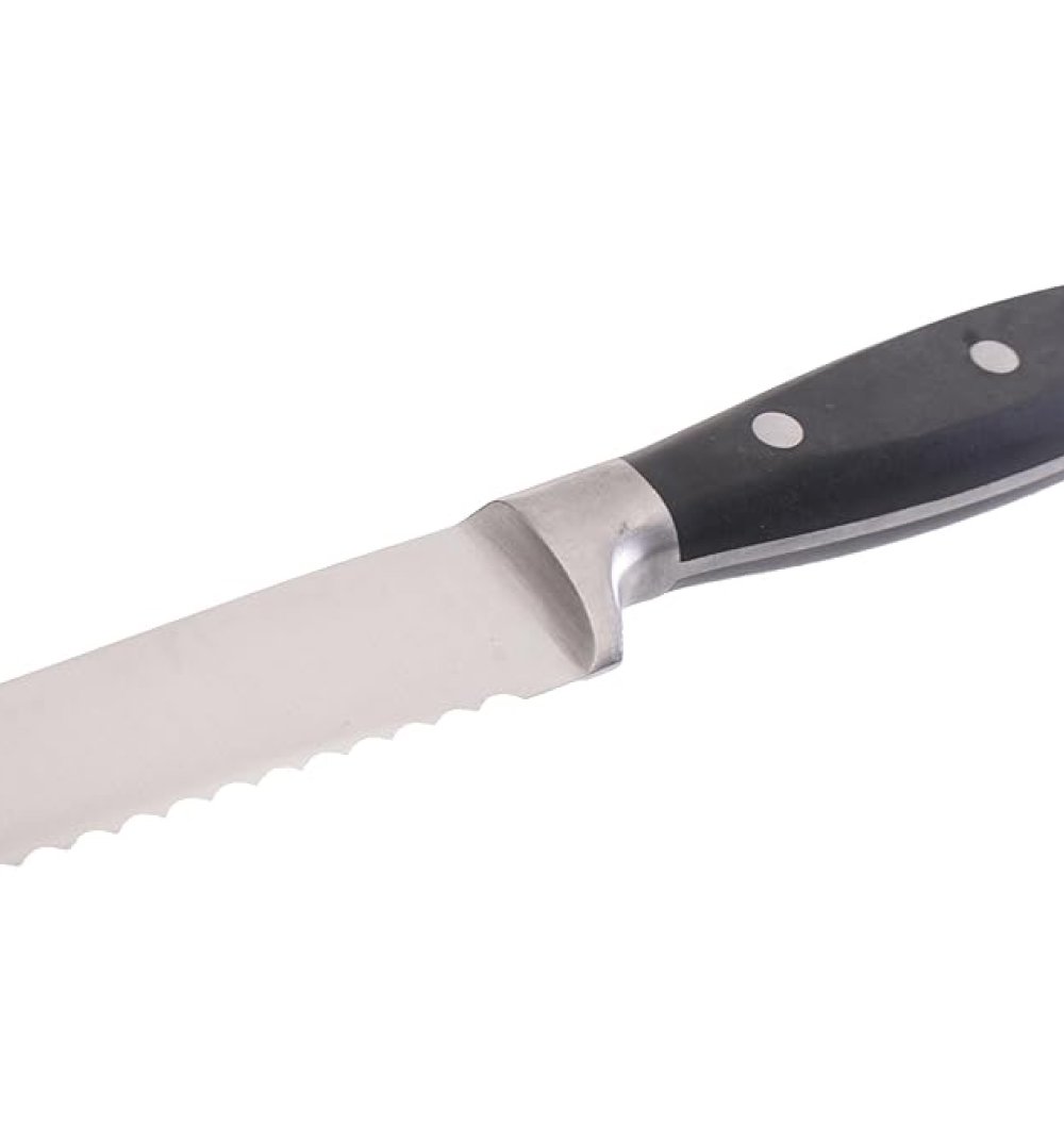 The 5-inch serrated stainless knife with black stainless Bakelite handle is designed with quality and functionality in mind. Crafted from premium materials, it offers a strong and stable surface for cutting and chopping. Durable, easy to clean, and resistant to stains, this cutting board is perfect for everyday use in any kitchen. A reliable choice for home cooks and professionals alike.